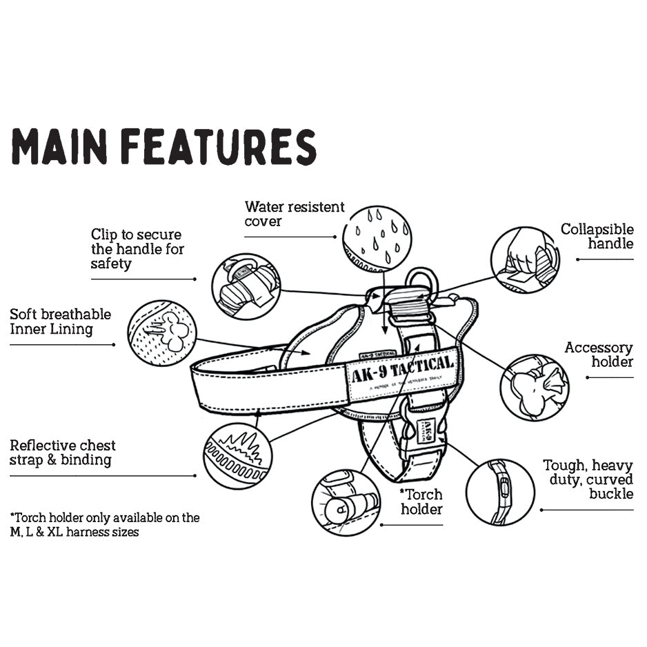 Please note:- The Extra Small and Small versions of the harness do not have the Torch Holder or Accessory Holder, as this would be too bulky for small dogs.